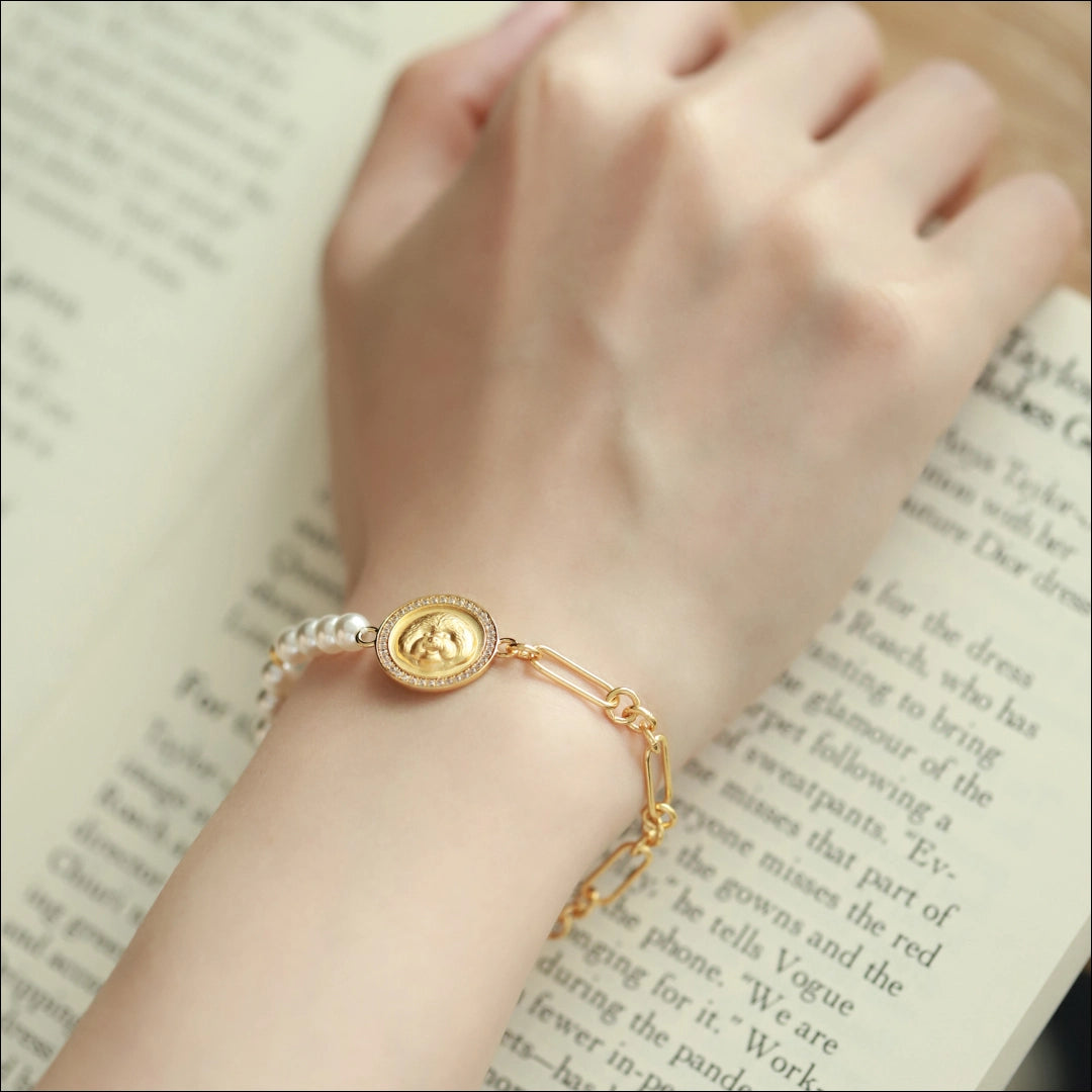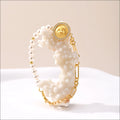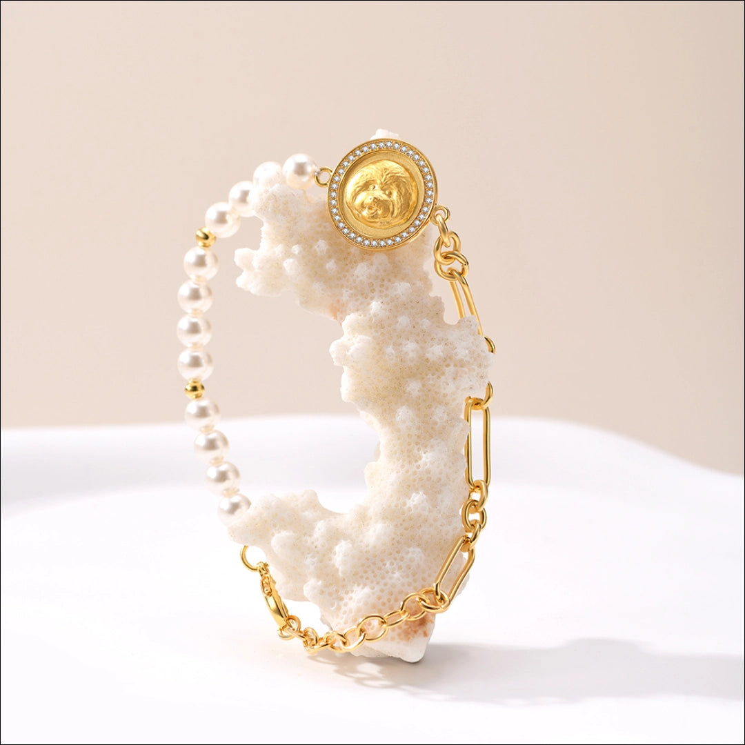 A sweet tribute to your fluffiest friend. The Bichon Bracelet features a delicately sculpted Bichon head framed by sparkling cubic zirconia, paired with a mix of lustrous pearls and fine chain links for a modern, playful balance.