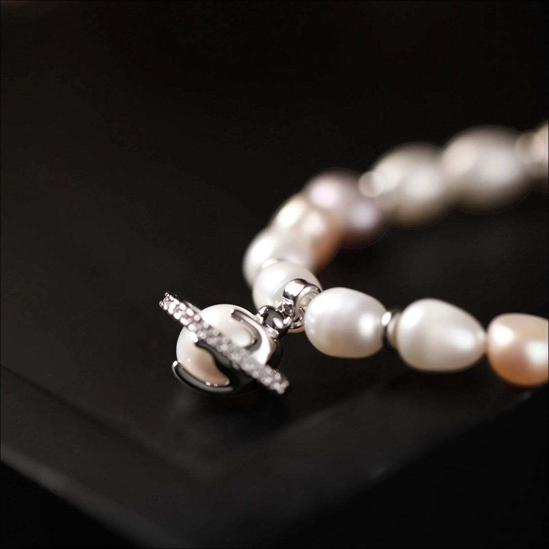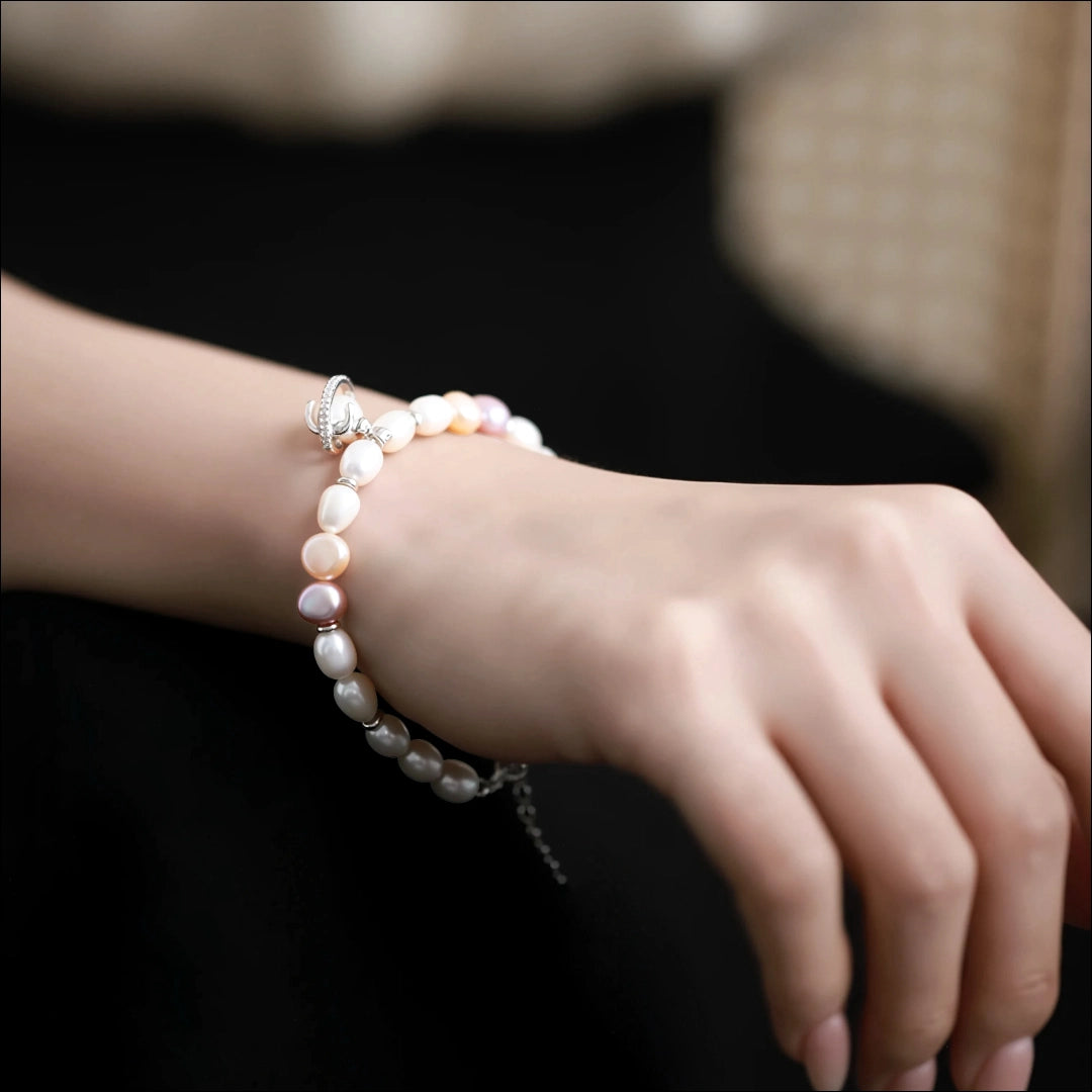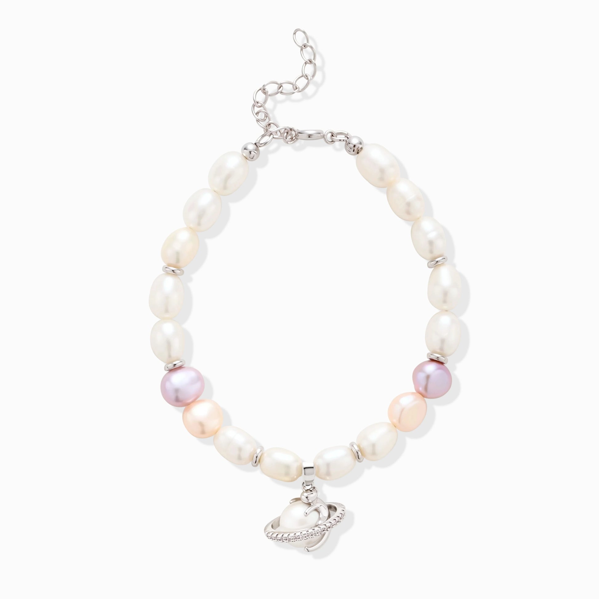 A delicate universe on your wrist. The Planet Meow Pearl Bracelet combines natural freshwater pearls in white, soft pink, and lavender, accented with sparkling high-quality cubic zirconia and charming cat-themed charms.